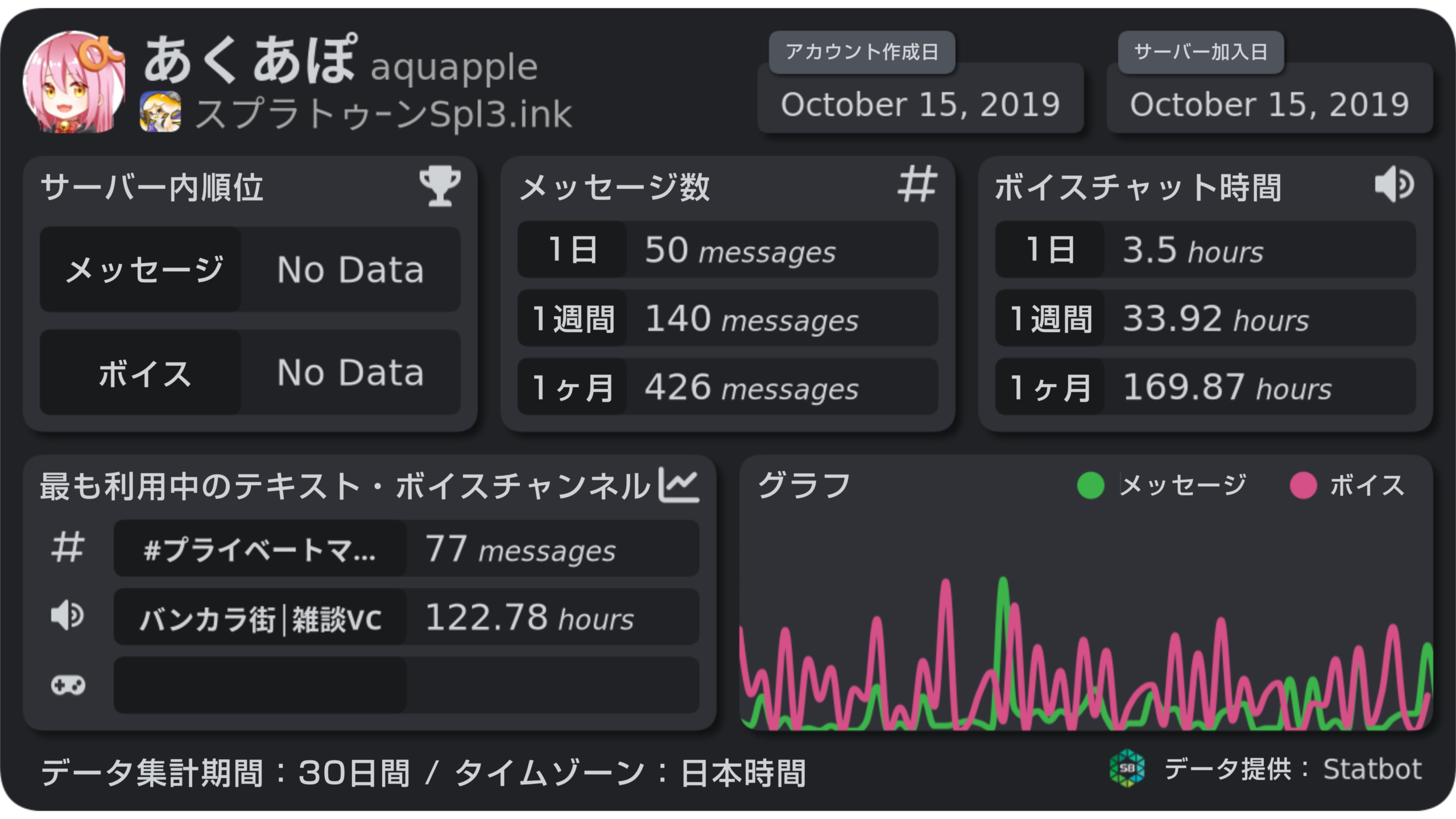 - 利用は任意です。`/me`コマンドを実行した時点で、サーバー在籍データの収集および解析・表示に同意したものとみなします。