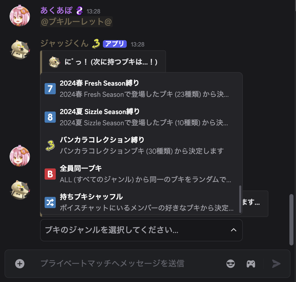 また、ブキルーレットのメニューにバンカラコレクションのブキの中からルーレットができる「バンカラコレクション縛り」を追加しました。